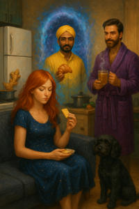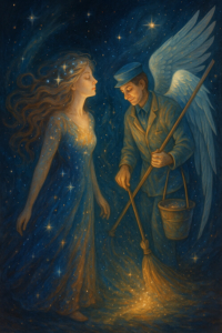 Mit Theobald, dem galaktischen Putzengel, entdeckt die Sternenkristallfrau, dass selbst Staubsaugen eine Zeremonie sein kann – und dass Schwingungen sich genauso gut wie Waschbecken polieren lassen.