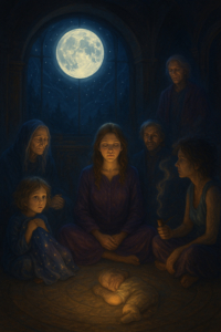 In der nächtlichen Versammlung ihrer inneren Selbste erkennt die Sternenkristallfrau, dass sie nicht zerrissen ist – sondern vollständig, weil all ihre Anteile endlich gemeinsam Platz am Feuer finden.